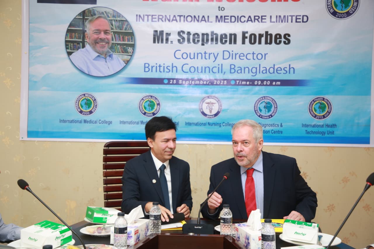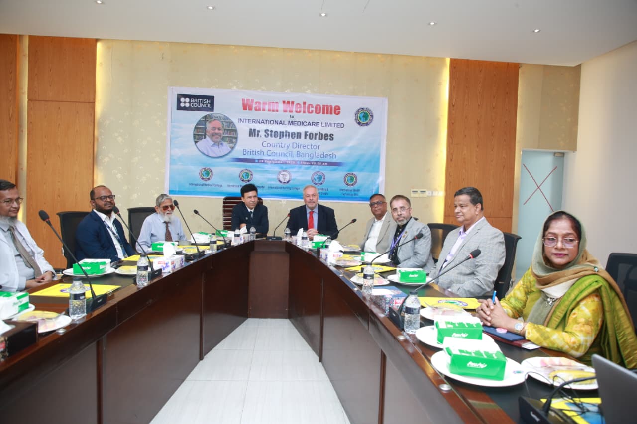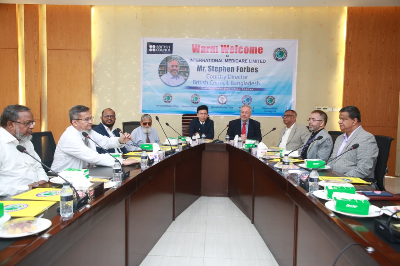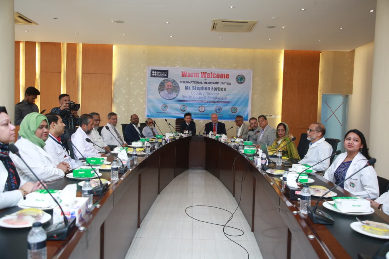 Mr. Stephen Forbes, Country Director of the British Council, Bangladesh, visited the International Medical College, International Nursing College and International Medical College Hospital today. A discussion meeting was held at this time. The meeting was presided over by Mr. M. A. Mubin Khan, Managing Director, IML and Chairman Governing Body, IMC. Also present at the meeting were all the heads of IML institutions. The meeting discussed the collaboration between the British Council and the International Medical College, International Nursing College & International Medical College Hospital regarding education system, health services, faculty development, research and e-resources.